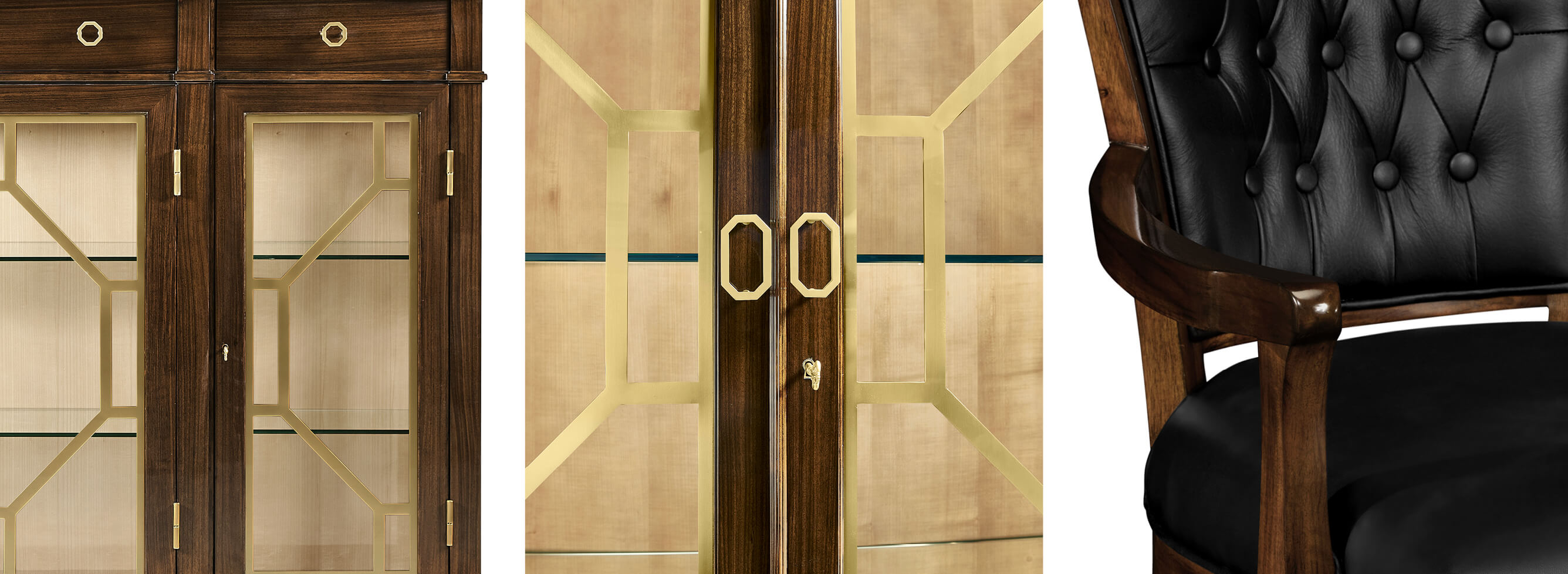 High lustre, dark rosewood four-door breakfront display cabinet with brass geometic shape details, interior lighting, glazed front, and three shallow drawers with brass handles...