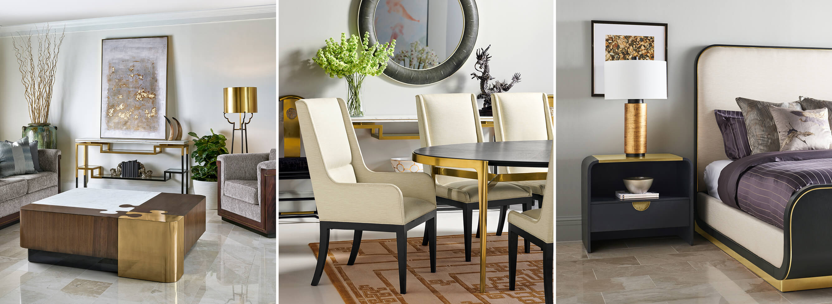 Table is constructed of hardwoods with a high sheen lacquer finish. Top features faux macassar ebony veneers with a brass insert. Decorative hardware is brass with a satin finish...