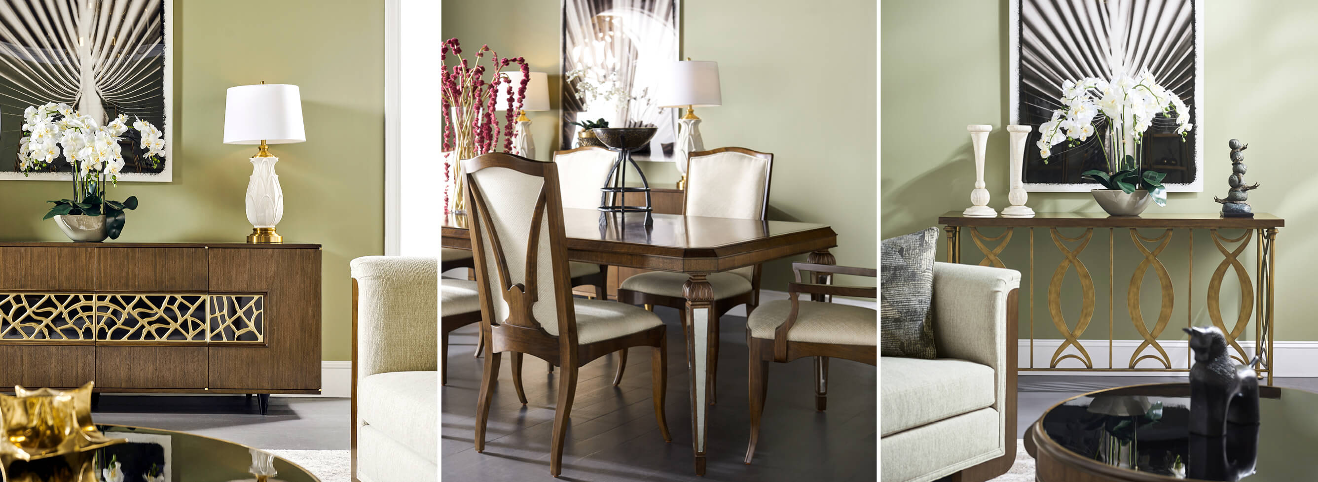 Table is constructed of American walnut with a hand rubbed lacquer finish. Top and pedestal include antiqued mirror inserts. Decorative hardware is solid brass with a satin brass finish...