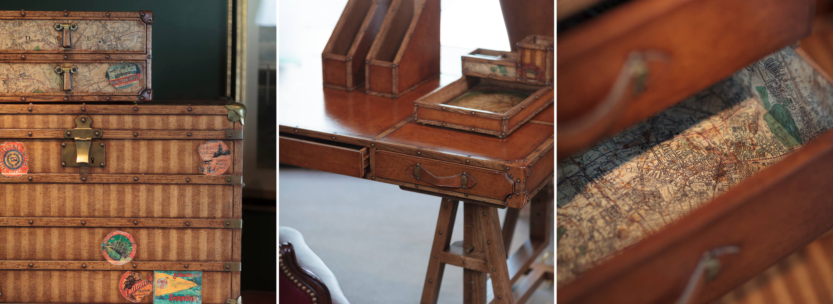 Travel trunk style oak and leather bound desktop chest with two drawers and vintage map and label details. (Old salescode: 494806)..