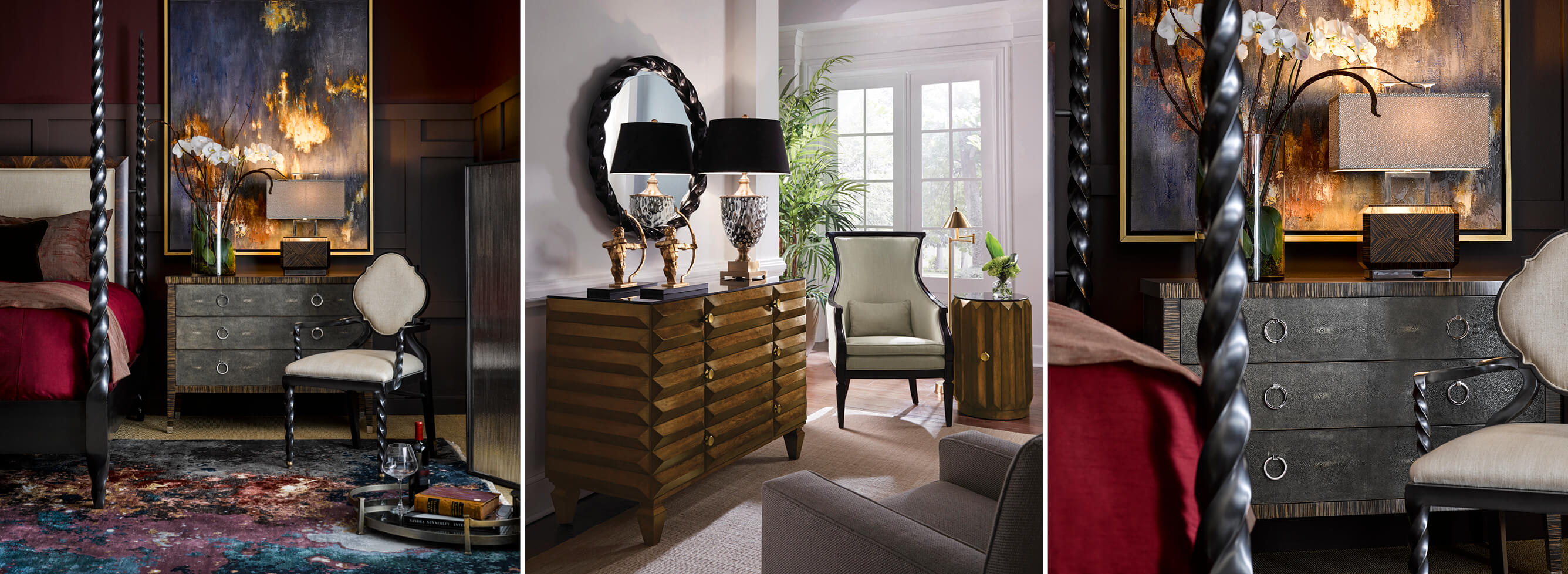 Contemporary styled tropical walnut crotch and hand carved three drawer chest with sharply defined tapering ebonised barleytwist legs, and finely detailed brass quatrefoil handles with mother of pearl inlay. (Old salescode: 495292-BLA)..
