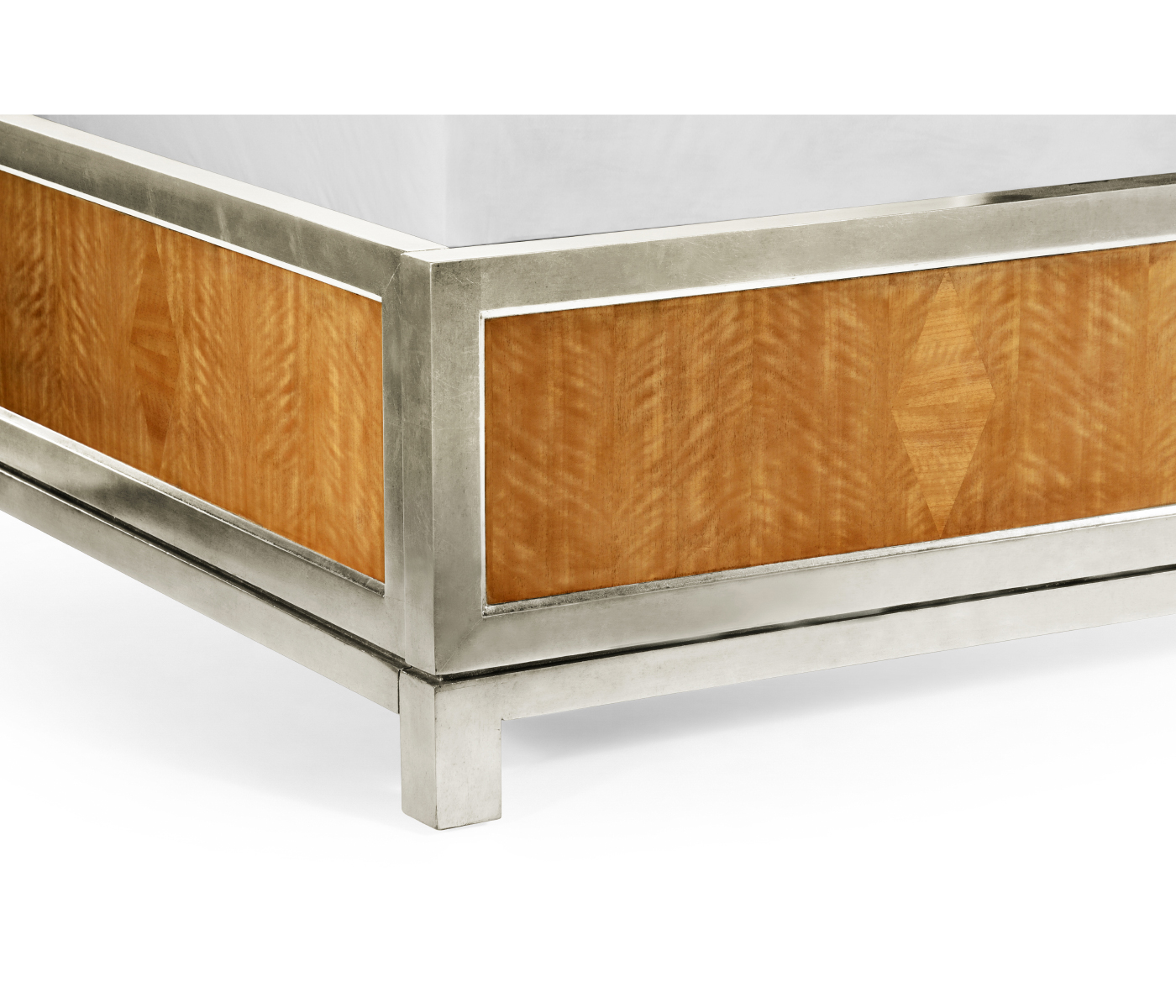 Elegant satinwood parquetry bed designed by Alexander Julian inspired by "Herringbone blazersuit" and signature argyle diamonds the rectangular wooden panels enclosed by a silvered aluminium frame.