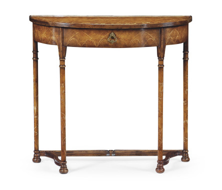 Walnut mirror frame with hand carved leather panels inset around the frame, plain beveled mirror and elaborate cast brass details in the corners.
