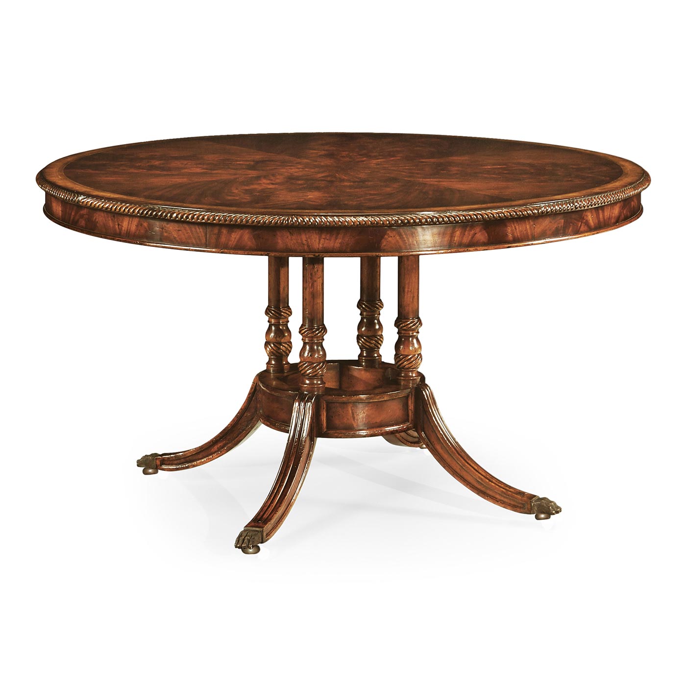 Crotch mahogany centre table with a gadrooned edge and an elegant bird cage base, reeded sabre legs. (Old salescode: 493091)