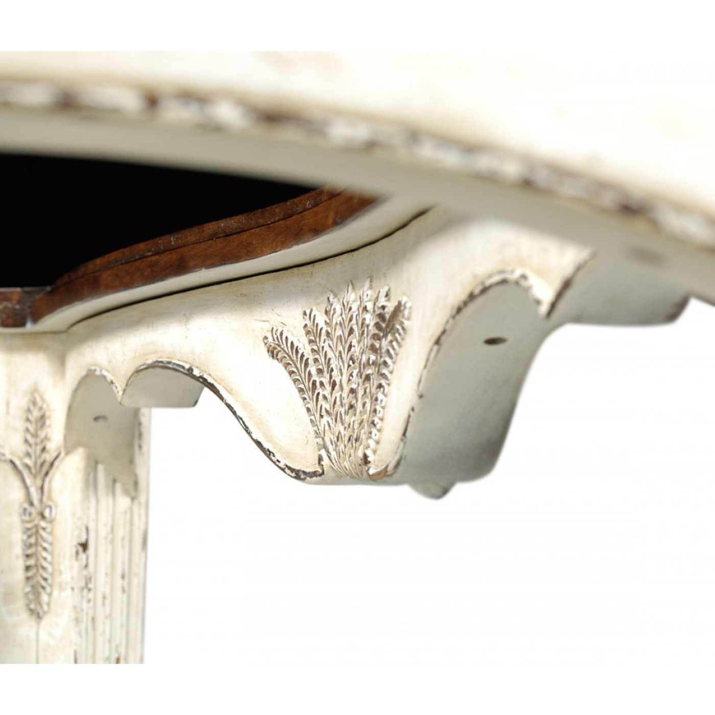 French provincial style antiqued white painted dining table with glass top and distressed planked hand carved legs and aprons with fern detailing set on fluted tapering legs with spade feet. Seats: 8.