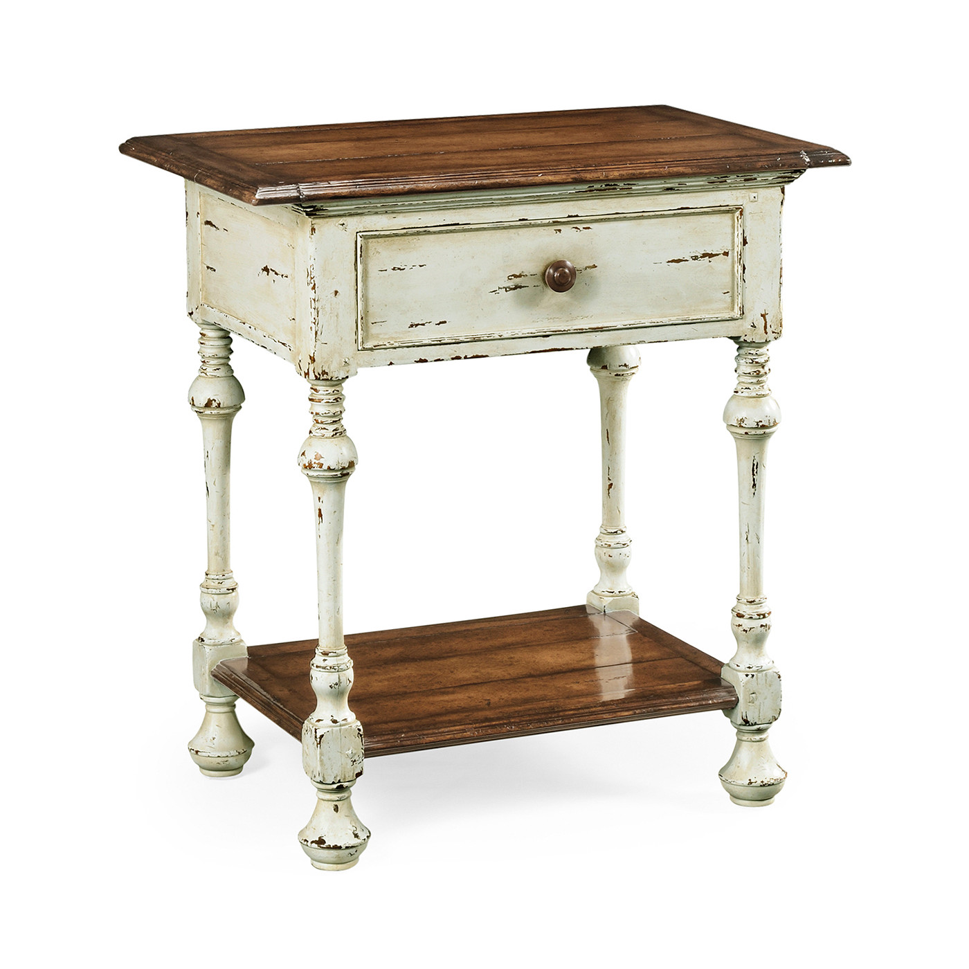 Planked walnut and white "rub-through" finish rectangular side table with tapering baluster legs and undertier inspired by Northern Italian country furniture.
