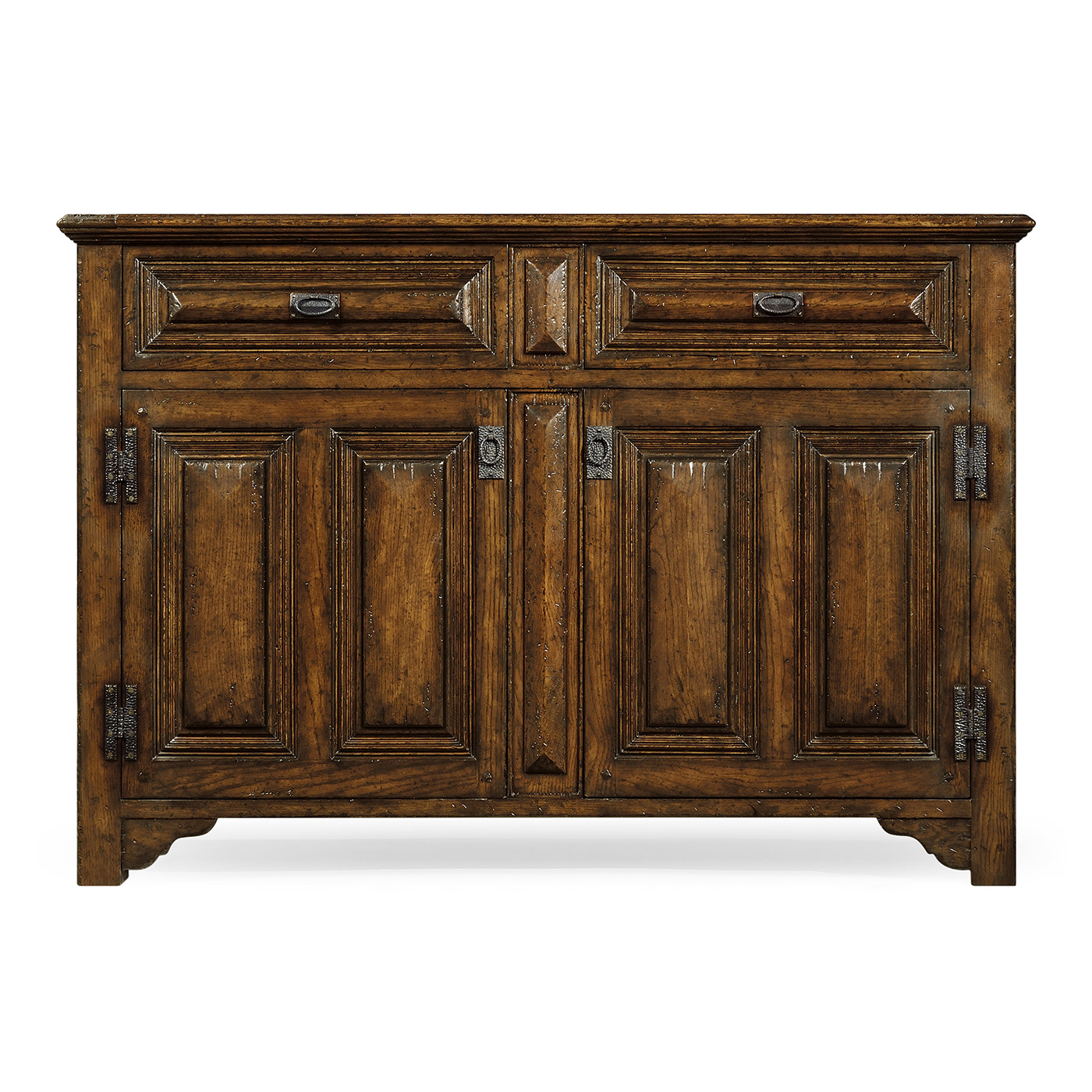 Dark oak substantial side cabinet with stepped pyramidial panelled mouldings to the two drawer fronts and doors, and stylised iron drawer handles and strap hinges. The design based on a transitional piece of c.1600. (Old salescode: 493560)