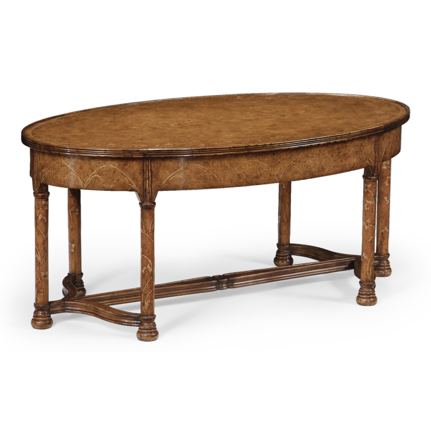 Burl walnut veneered oval coffee table in the "Gothic" style of the late 18th century having fine contrasting inlays to the top and frieze, the legs with painted running floral motifs and arches.