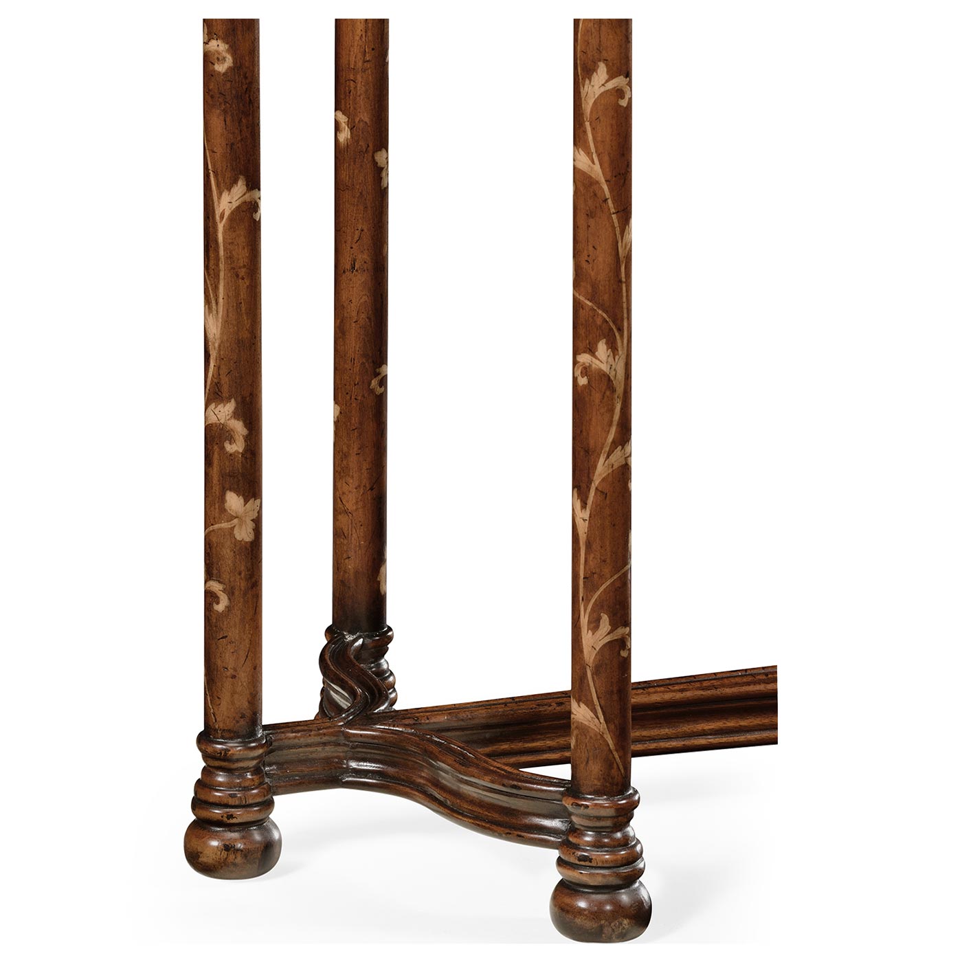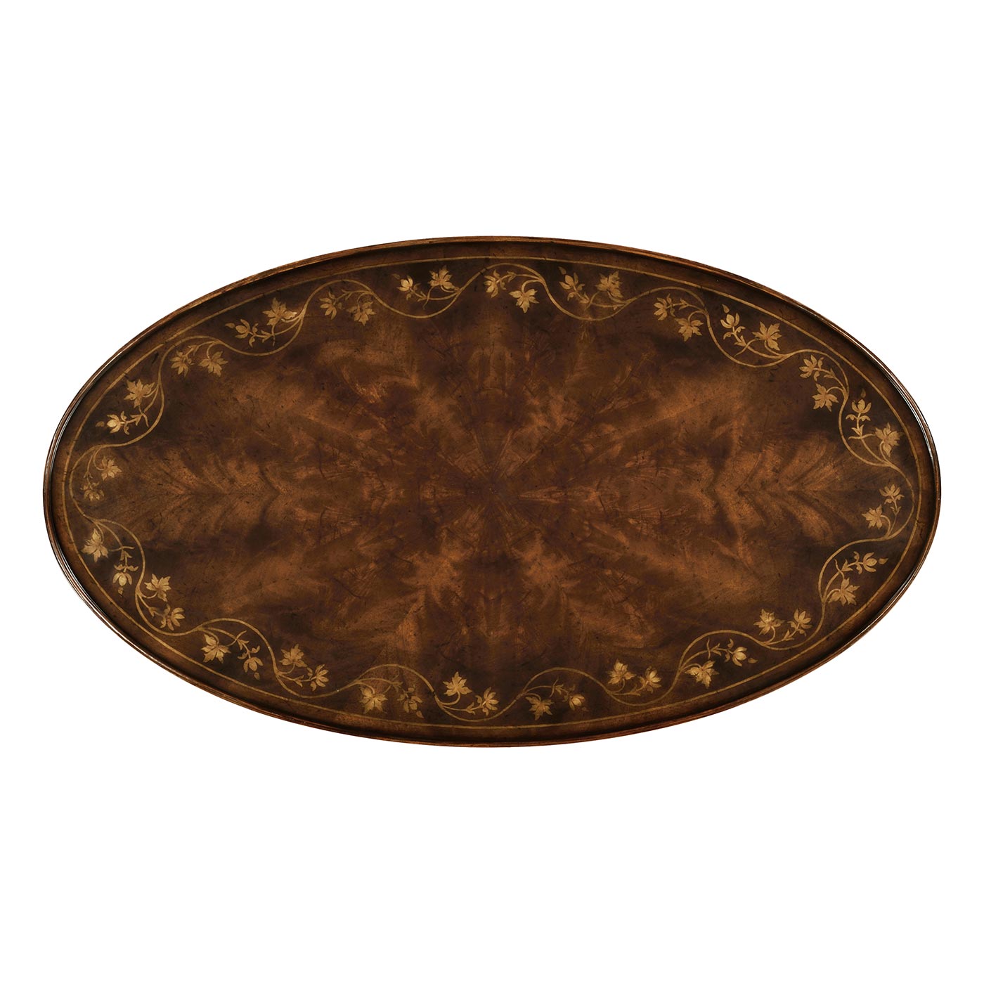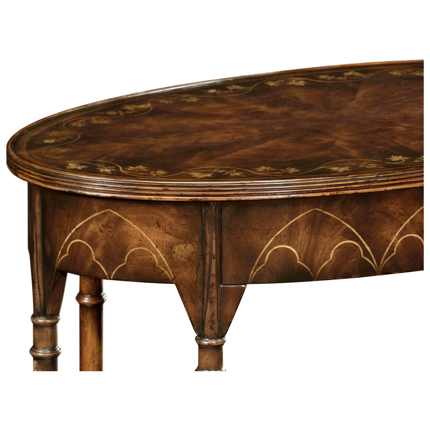 Mahogany veneered oval side table in the "Gothic" style of the late 18th century having fine contrasting inlays to the top and frieze, and legs painted with the same running floral motifs and arches.