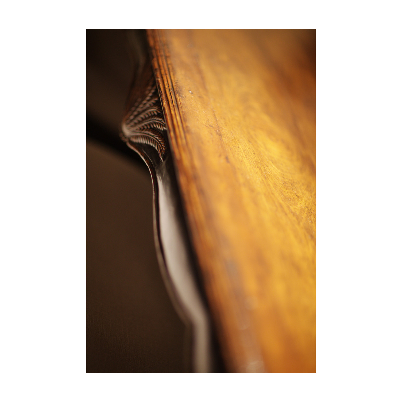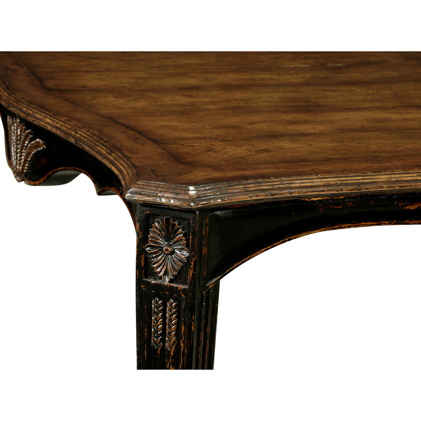 French provincial style antiqued black painted dining table with distressed planked walnut top hand carved legs and aprons with fern detailing set on fluted tapering legs with spade feet. Seats: 8.